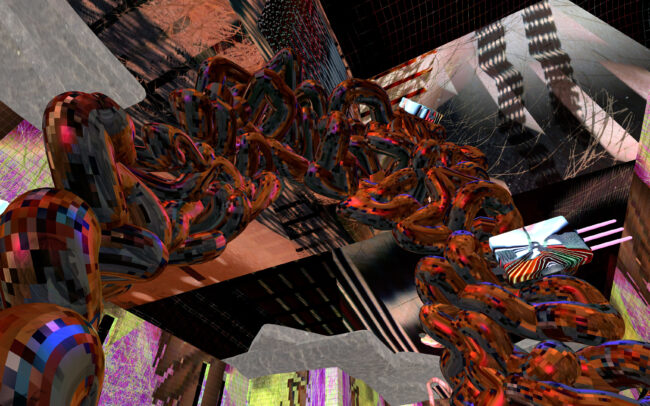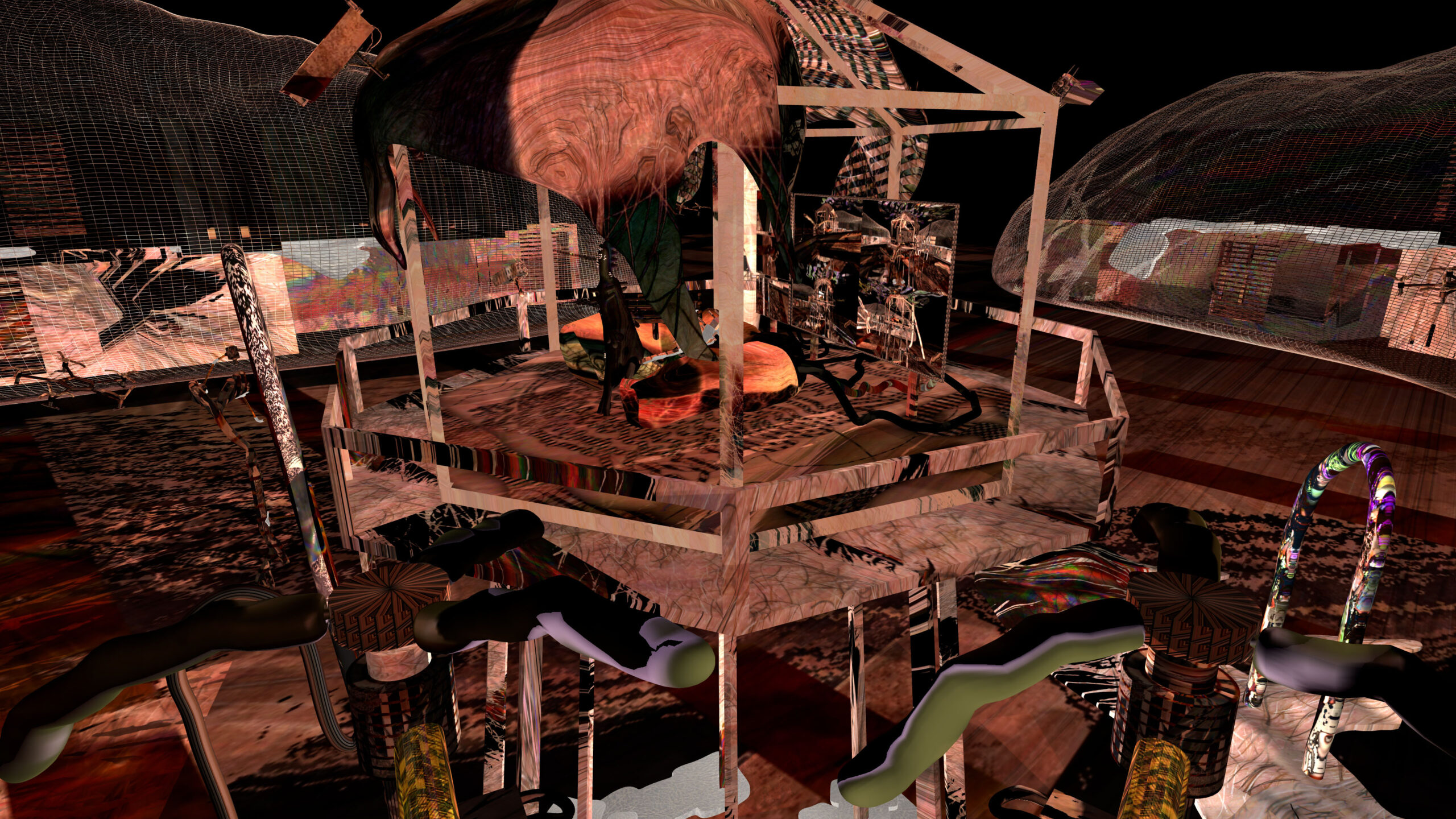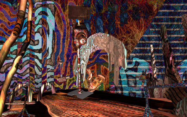 Eight channel Video Installation with 3D Animation, sculpture; objects, custom wallpaper, and sound // dimensions variable // 2023